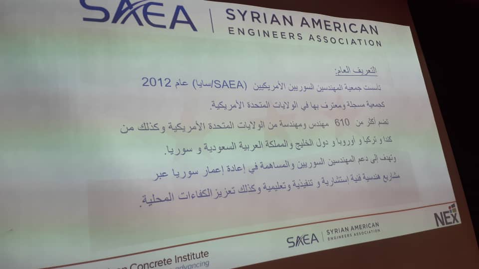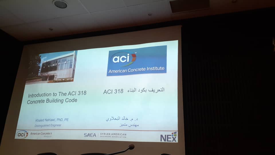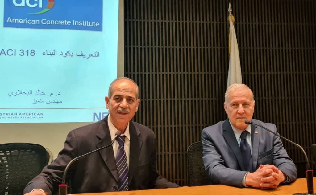 برعاية نقابة المهندسين السوريين وجمعية المهندسين السوريين الأمريكيين أقيمت محاضرة للمغترب السوري الدكتور المهندس محمد خالد نحلاوي من معهد الخرسانة الأمريكية بعنوان تقييم وإصلاح وإعادة تأهيل الهياكل الخرسانية القائمة( Ac1-562 code) بحضور المهندس محمد أيمن الحافظ رئيس مجلس فرع دمشق لنقابة المهندسين وعدد من الاختصاصات بهذا المجال من دكاترة ومهندسين استشاريين وطلاب .