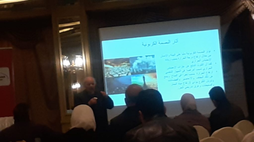 ومن الجمعية السورية للطاقات المتجددة والبيئة والموارد الطبيعية وتغير المناخ شارك الدكتور المهندس علاء الدين الهيب بمحاضرة عن كيفية اعتماد البصمة الكربونية في سوريا حيث أشار لتغير المناخ الذي تسببه البصمة الكربونية مؤكدا على ضرورة الاهتمام بالموارد الطبيعية والمحافظة عليها خاصة الماء .