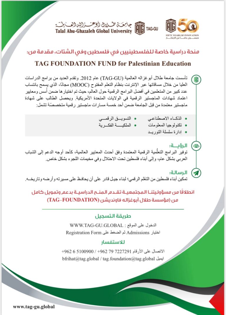 عمان – أعلن رئيس ومؤسس مجموعة طلال أبوغزاله العالمية، الدكتور طلال أبوغزاله عن منحة جديدة للفلسطينيين في المخيمات وتحت الاحتلال، تشمل تعليم اللغة الإنجليزية مجانا في جامعة طلال أبوغزاله العالمية، وبموجب شهادة TAG English Exam. وأعلن الدكتور أبوغزاله سابقا عن…